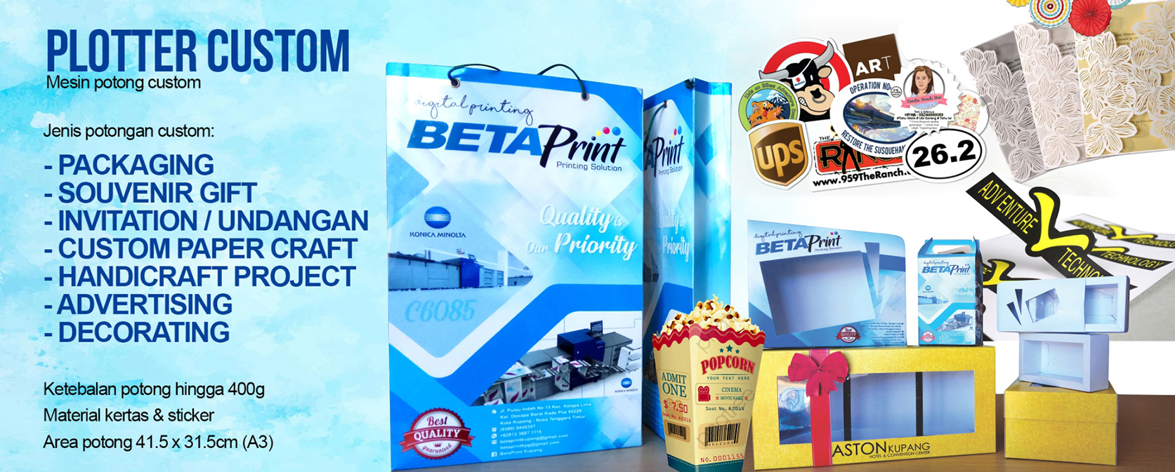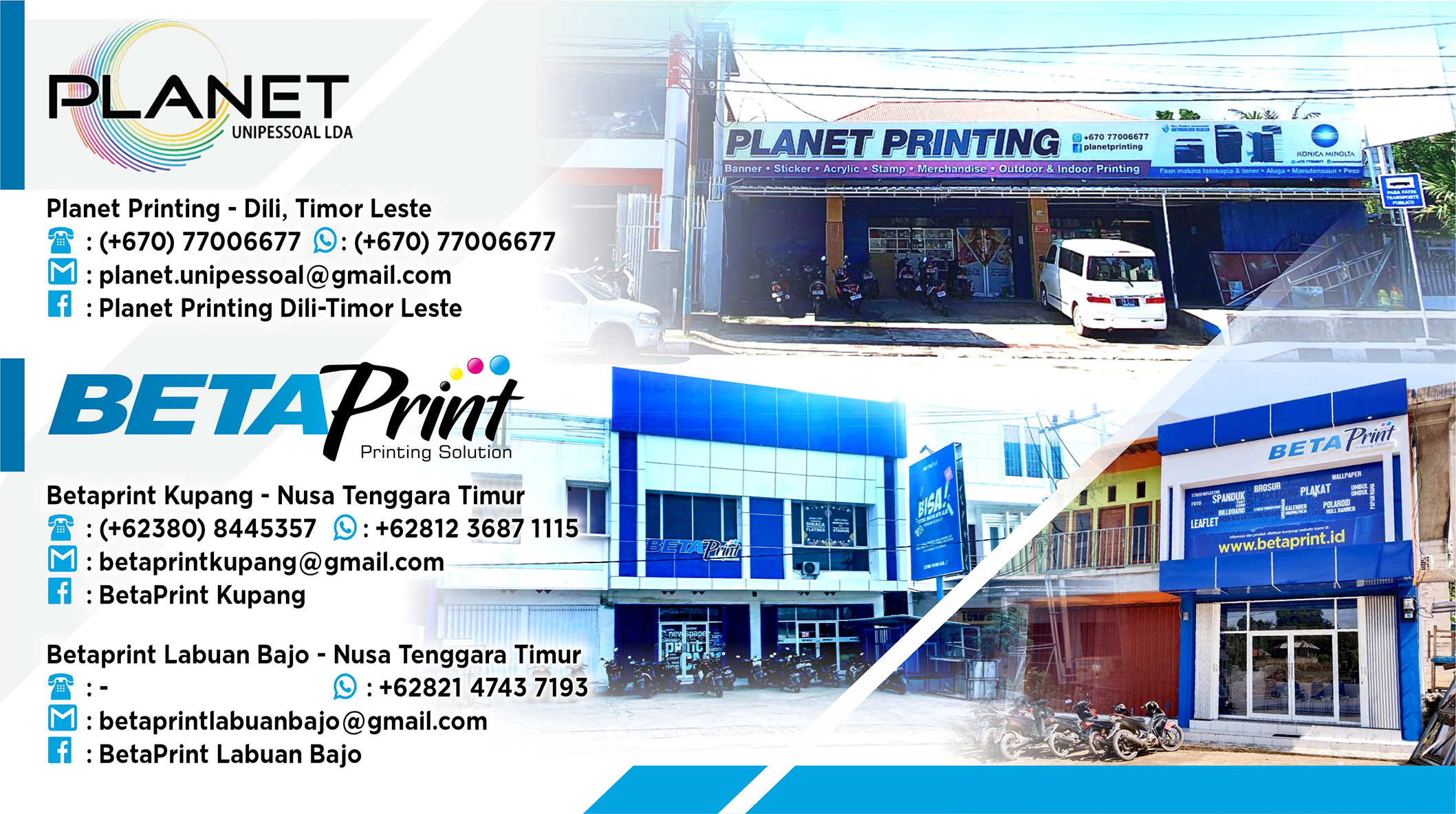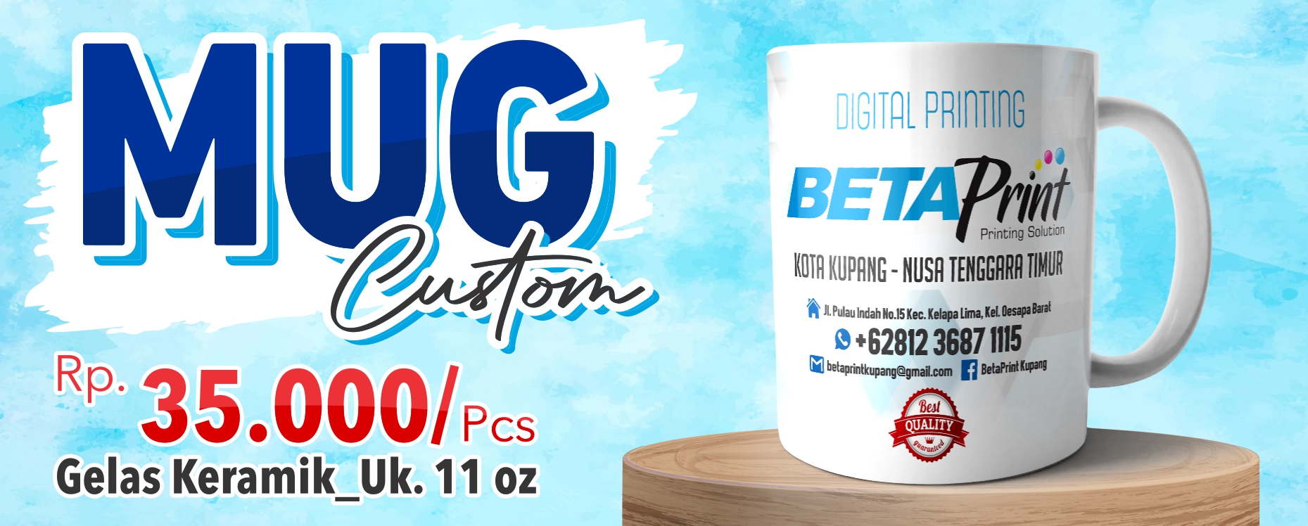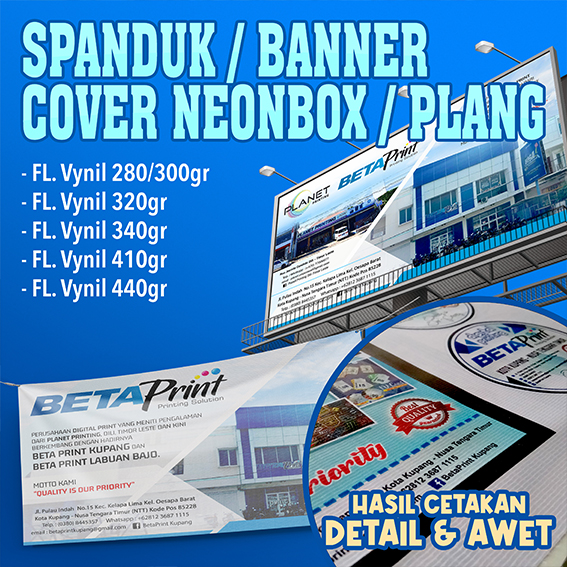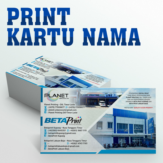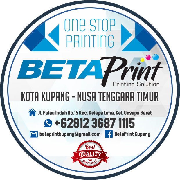 Beta Print adalah percetakan yang berpengalaman sejak 2004 melalui Planet Printing di Dili, Timor Leste, dan resmi berdiri di Kupang pada 2018 dengan mesin-mesin yang telah teruji dan siap bersaing di Kupang, Labuan Bajo, dan sekitarnya. Mengusung moto “Quality is Our Priority,” Beta Print menjadikan kualitas cetak sebagai prioritas utama, didukung oleh pelayanan optimal, pengerjaan efisien, serta garansi cetak ulang untuk produk cacat. Dengan mesin digital printing modern yang menghasilkan cetakan tajam, akurat, dan vibrant, proses produksi dilakukan cepat tanpa minimal order, cocok untuk personalisasi, dan dilengkapi layanan desain baik secara langsung maupun online. Meski berorientasi pada kualitas tinggi, Beta Print tetap menawarkan harga kompetitif dan waktu produksi cepat, termasuk layanan dan harga khusus untuk pelanggan loyal seperti reseller. Berlokasi di Kupang dan Labuan Bajo, Beta Print hadir sebagai solusi percetakan terpercaya dengan jangkauan luas di wilayah NTT, ideal bagi UMKM, penyelenggara event, dan proyek pemerintah daerah.